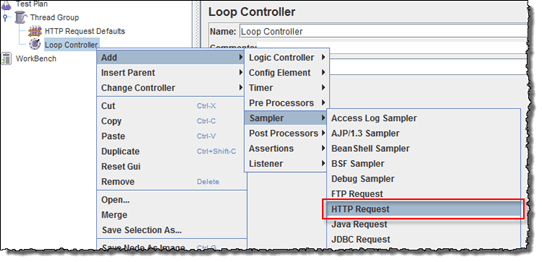 右键单击循环控制器,添加 -> 采样器 -> HTTP 请求
