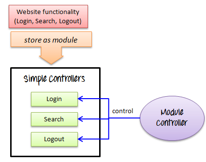 一般的想法是,Web 应用程序由小的功能单元(即登录、创建账户、注销…)组成。这些功能可以作为“模块”存储在简单控制器中。模块控制器将选择需要运行哪个模块。