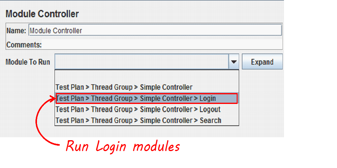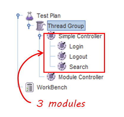 您可以使用 JMeter 创建 3 个模块。每个模块模拟一个用户活动:登录、注销和搜索。