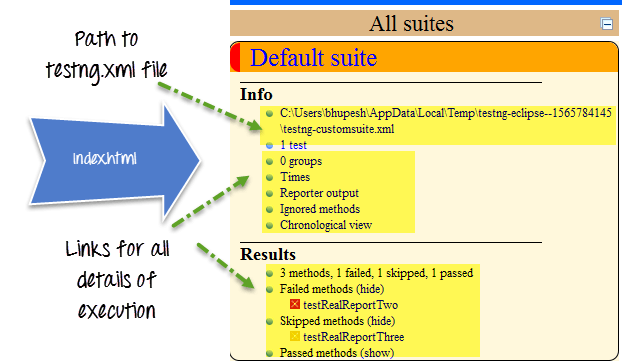 Index.html: 这是当前执行的完整报告,包含错误、组、时间、报告器日志、testng XML 文件等信息。