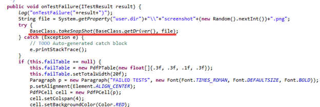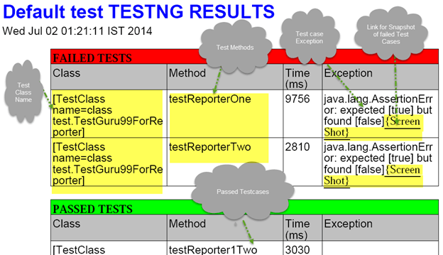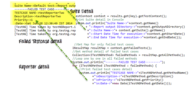 package testNGReport.iReporterReport; import java.util.Collection; import java.util.Date; import java.util.List; import java.util.Map; import java.util.Set; import org.testng.IReporter; import org.testng.IResultMap; import org.testng.ISuite; import org.testng.ISuiteResult; import org.testng.ITestContext; import org.testng.ITestNGMethod; import org.testng.xml.XmlSuite; public class Guru99Reporter implements IReporter{ @Override public void generateReport(List<XmlSuite> arg0, List<ISuite> arg1, String outputDirectory) { // Second parameter of this method ISuite will contain all the suite executed. for (ISuite iSuite : arg1) { //Get a map of result of a single suite at a time Map<String,ISuiteResult> results = iSuite.getResults(); //Get the key of the result map Set<String> keys = results.keySet(); //Go to each map value one by one for (String key : keys) { //The Context object of current result ITestContext context = results.get(key).getTestContext(); //Print Suite detail in Console System.out.println("Suite Name->"+context.getName() + "::Report output Ditectory->"+context.getOutputDirectory() +"::Suite Name->"+ context.getSuite().getName() +"::Start Date Time for execution->"+context.getStartDate() +"::End Date Time for execution->"+context.getEndDate()); //Get Map for only failed test cases IResultMap resultMap = context.getFailedTests(); //Get method detail of failed test cases Collection<ITestNGMethod> failedMethods = resultMap.getAllMethods(); //Loop one by one in all failed methods System.out.println("--------FAILED TEST CASE---------"); for (ITestNGMethod iTestNGMethod : failedMethods) { //Print failed test cases detail System.out.println("TESTCASE NAME->"+iTestNGMethod.getMethodName() +"\nDescription->"+iTestNGMethod.getDescription() +"\nPriority->"+iTestNGMethod.getPriority() +"\n:Date->"+new Date(iTestNGMethod.getDate())); } } } } }