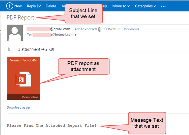 //After complete execution send pdf report by email @AfterSuite public void tearDown(){ sendPDFReportByGMail("FROM@gmail.com", "password", "TO@gmail.com", "PDF Report", ""); } /** * Send email using java * @param from * @param pass * @param to * @param subject * @param body */ private static void sendPDFReportByGMail(String from, String pass, String to, String subject, String body) { Properties props = System.getProperties(); String host = "smtp.gmail.com"; props.put("mail.smtp.starttls.enable", "true"); props.put("mail.smtp.host", host); props.put("mail.smtp.user", from); props.put("mail.smtp.password", pass); props.put("mail.smtp.port", "587"); props.put("mail.smtp.auth", "true"); Session session = Session.getDefaultInstance(props); MimeMessage message = new MimeMessage(session); try { //Set from address message.setFrom(new InternetAddress(from)); message.addRecipient(Message.RecipientType.TO, new InternetAddress(to)); //Set subject message.setSubject(subject); message.setText(body); BodyPart objMessageBodyPart = new MimeBodyPart(); objMessageBodyPart.setText("Please Find The Attached Report File!"); Multipart multipart = new MimeMultipart(); multipart.addBodyPart(objMessageBodyPart); objMessageBodyPart = new MimeBodyPart(); //Set path to the pdf report file String filename = System.getProperty("user.dir")+"\\Default test.pdf"; //Create data source to attach the file in mail DataSource source = new FileDataSource(filename); objMessageBodyPart.setDataHandler(new DataHandler(source)); objMessageBodyPart.setFileName(filename); multipart.addBodyPart(objMessageBodyPart); message.setContent(multipart); Transport transport = session.getTransport("smtp"); transport.connect(host, from, pass); transport.sendMessage(message, message.getAllRecipients()); transport.close(); } catch (AddressException ae) { ae.printStackTrace(); } catch (MessagingException me) { me.printStackTrace(); } } }