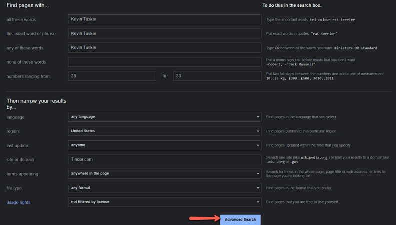 要执行此搜索,您需要访问 Google 高级搜索,网址为 https://www.google.com/advanced_search,并填写正确的输入字段,例如姓名。例如:查找包含 -所有这些词- Kevin Tusker,-此确切词语或短语- Kevin Tusker 等页面。完成后,您可以点击高级搜索按钮并查看结果。
